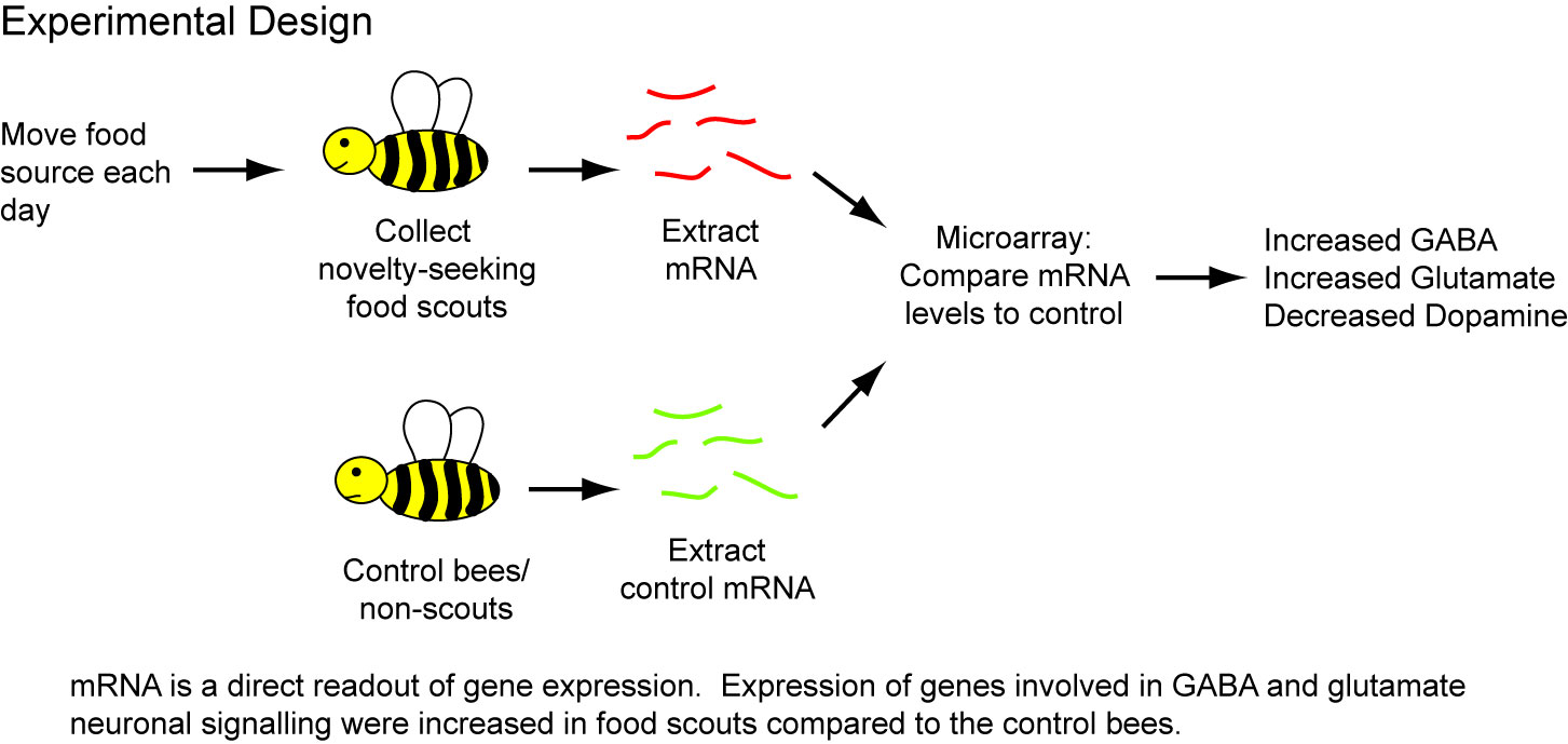 All worker bees are female and have the same genetic make up— they’re all identical sisters. What would make some bees more likely to explore novel environments? To examine this question, the authors collected food scouts. While the bees slept in their hives, the authors introduced a new feeder in different locations each day. They collected bees that visited the new feeder twice, when it was in two different locations. Once they had the food scouts, they performed a microarray to determine differences in gene expression between food scouts and non-scout controls.