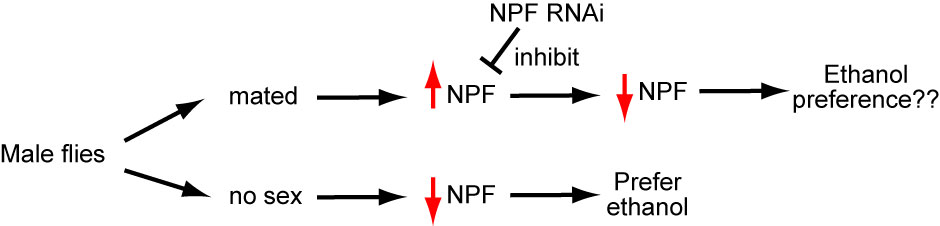 To summarize, mating increases NPF expression and increased NPF expression makes the flies less attracted to ethanol.