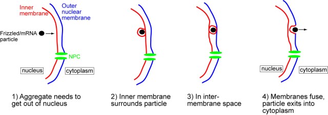 The researchers did lots of imaging of the Frizzled foci and found something strange. They sometimes would see an aggregate surrounded by nuclear membrane on both sides. In other words, the aggregates appeared to be in the space in between the inner and outer membranes. What?! They also imaged the foci over time and could see them staying intact as they leave the nucleus. In the end, what they believe is happening is that the particles get surrounded by the inner membrane and then pinch off into the intermembrane space. At that point they are surrounded all the way around by a sphere of membrane. That membrane fuses with the outer membrane, spitting out the particles into the cytoplasm. See the figure below for a visual representation of this process. The role of LamC in this process is probably to help promote rearrangement of the membrane scaffold to allow nuclear budding.