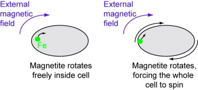 | The cell on the left has unattached magnetite (Fe), whereas on the right it is attached to the membrane. |
